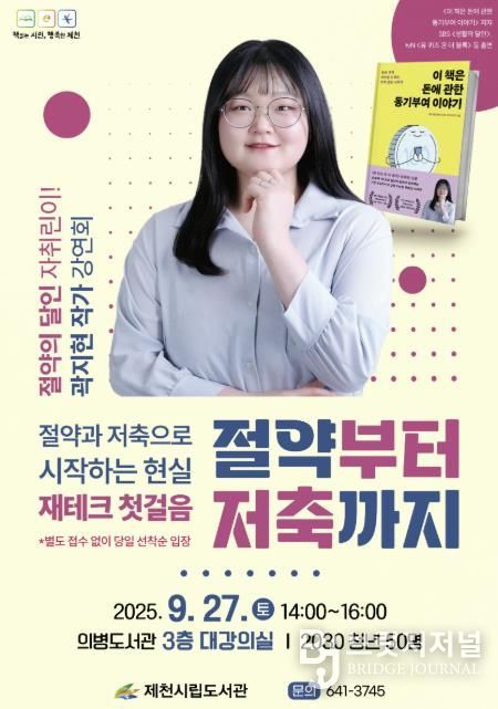 브릿지저널 김경미 기자 | 제천시립도서관은 오는 27일 오후 2시, 의병도서관 3층 대강의실에서 곽지현 작가 초청 강연 '절약부터 저축까지'를 개최한다.