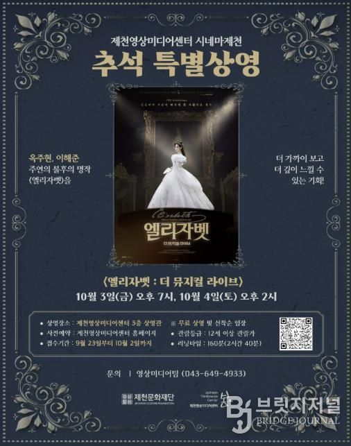 브릿지저널 김경미 기자 | 제천문화재단이 추석 연휴 기간인 10월 3일 오후 7시와 10월 4일 오후 2시, 제천영상미디어센터 3층 상영관에서 옥주현 주연의 뮤지컬 공연 실황 영화 '엘리자벳 : 더 뮤지컬 라이브'를 무료 상영한다.