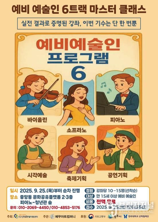 모집 대상은 만 15세 이상 예비 예술인(중·고·대학생 및 성인 일반인 포함)이며, 수강비는 전액 무료다. 신청은 9월 15일부터 24일까지 선착순으로 접수한다.
