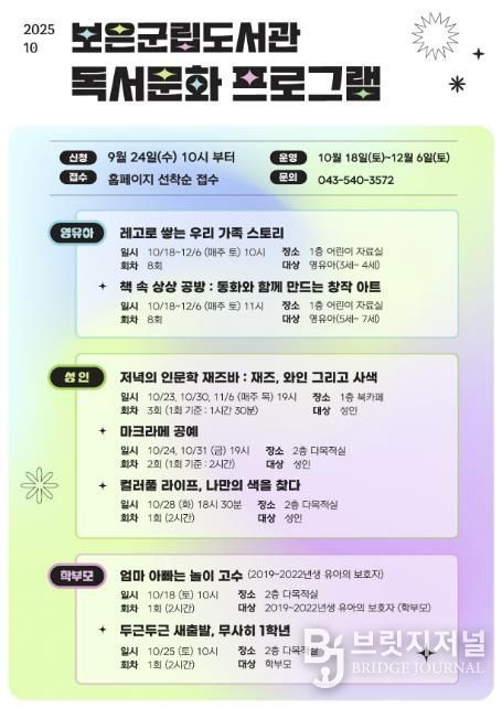 브릿지저널 김경미 기자 | 보은군립도서관은 오는 24일 오전 10시부터 ‘2025년 하반기 프로그램’ 수강생 모집에 들어간다. 이번 프로그램은 유아, 성인, 부모 등 다양한 계층을 대상으로 총 7개 강좌가 마련됐다.