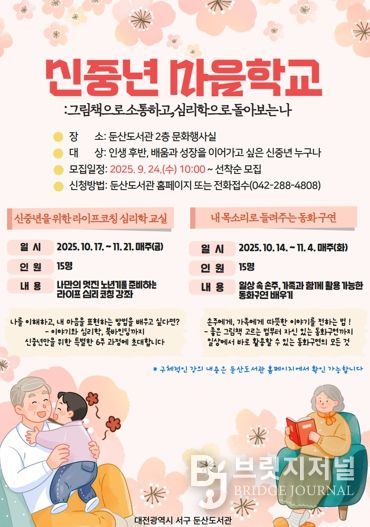브릿지저널 정보영 기자 | 대전 서구 둔산도서관은 퇴직 후 새로운 삶을 준비하는 ‘신중년’ 주민을 대상으로 ‘신중년 마음 학교’ 프로그램을 운영한다고 22일 전했다.