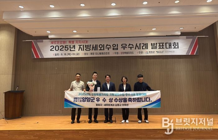브릿지저널 윤나영 기자 | 양양군은 지난 9월 19일 강원도 평창 모나 용평리조트에서 열린 ‘2025 지방세외수입 우수사례 발표대회’에서 신규수입원발굴 부문 우수상을 수상했다.