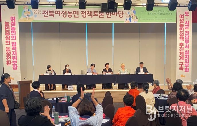 브릿지저널 윤나영 기자 | 전북특별자치도는 9월 22일 오후 2시 부안 해나루 가족호텔에서 '2025 전북여성농민 정책토론 한마당'을 개최했다고 밝혔다. 이번 토론회에는 여성농업인 150여 명이 참석해 여성농업인의 지위와 역할을 제도적으로 보장하기 위한 다양한 방안을 논의하며 현장의 목소리를 적극 전달하는 자리가 됐다.