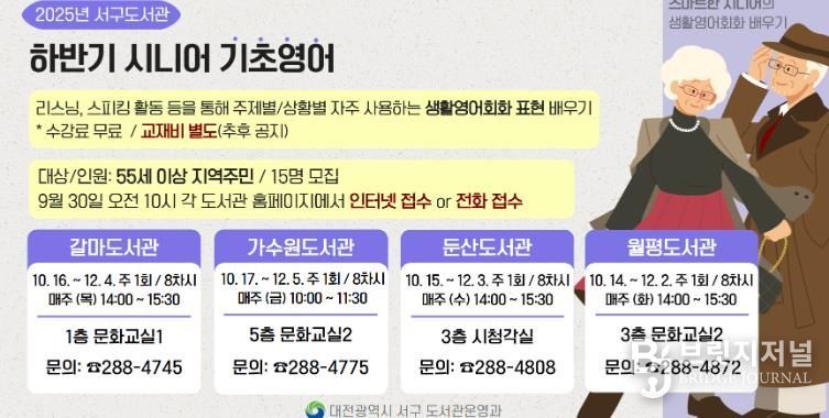 브릿지저널 정보영 기자 | 대전 서구는 관내 4개 도서관에서 55세 이상 지역 주민을 대상으로 ‘2025년 하반기 시니어 기초영어’ 강좌를 개강한다고 23일 밝혔다.