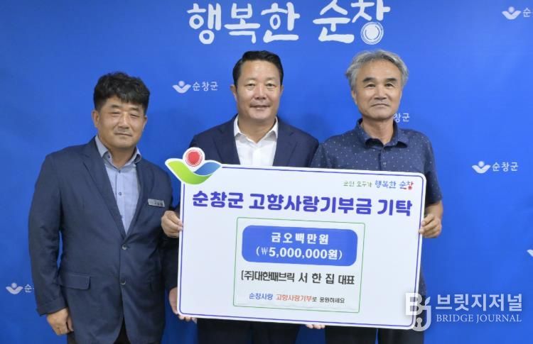 브릿지저널 윤나영 기자 | 순창 출신 기업인 (주)대한패브릭 서한집 대표이사가 23일 순창군에 고향사랑기부금 500만원을 전달하며 올해로 3년째 고향사랑을 실천했다.