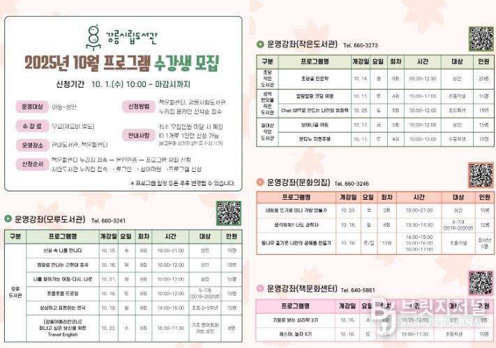 브릿지저널 윤나영 기자 | 강릉시립도서관은 오는 10월 1일부터 '2025년 10월 프로그램'에 참여할 수강생을 모집한다.