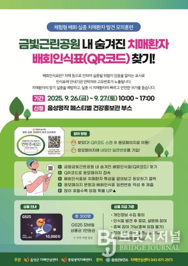 브릿지저널 김경미 기자 | 음성군 치매안심센터는 이달 26일부터 27일까지 금왕읍 금빛근린공원 일원에서 치매환자 실종 예방과 치매 인식 개선을 위한 ‘숨겨진 배회인식표(QR코드) 찾기’ 체험행사를 개최한다고 밝혔다.