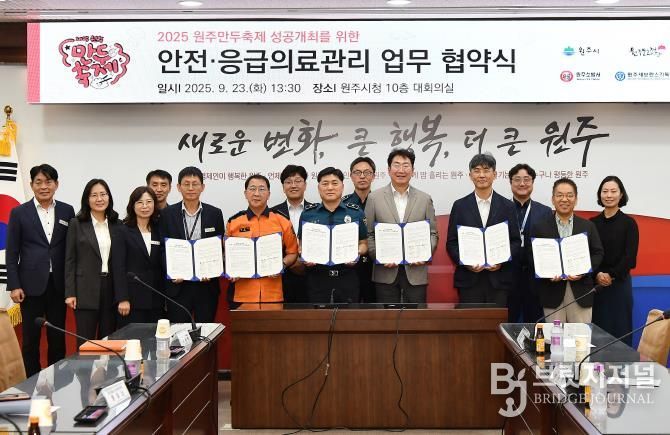 브릿지저널 윤나영 기자 | 원주시는 ‘2025 원주만두축제’의 안전하고 성공적인 개최를 위해 지난 23일 원주경찰서, 원주소방서, 원주세브란스기독병원, 성지병원과 함께 안전·응급의료관리 업무협약을 체결했다.