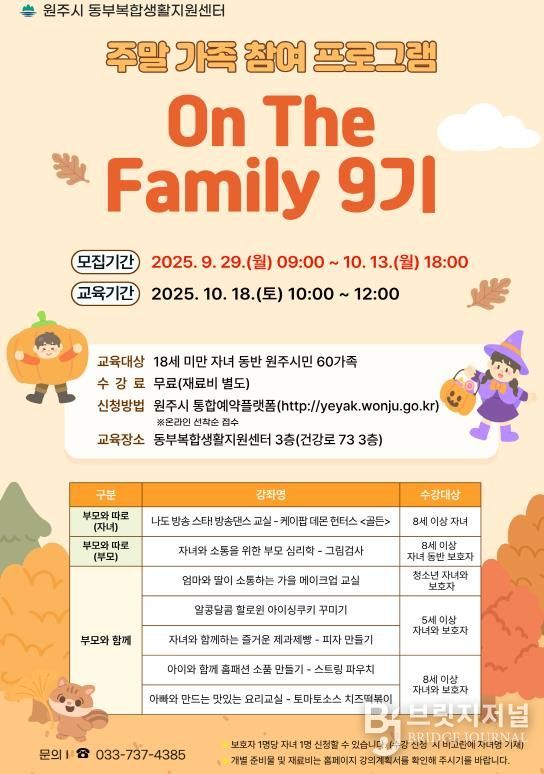 브릿지저널 윤나영 기자 | 원주시동부복합생활지원센터는 오는 10월 18일, 주말 가족 프로그램 ‘온 더 패밀리(On The Family)’ 9기 과정을 운영한다.