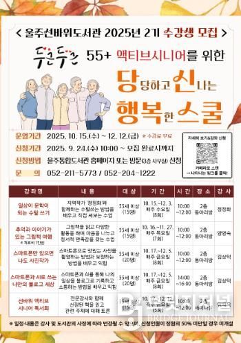 브릿지저널 윤나영 기자 | 울주선바위도서관이 액티브시니어를 위한 차별화된 독서문화프로그램 ‘액티브시니어 당신행복스쿨’ 2기 수강생을 모집한다고 24일 밝혔다.