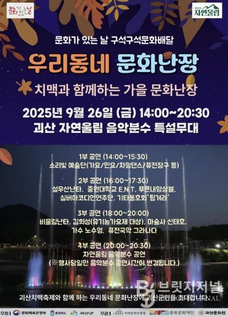 브릿지저널 김경미 기자 | 충북 괴산군은 ‘문화가 있는 날’ 주간을 맞아 오는 26일 오후 2시, 자연울림 음악분수 앞 특설무대에서 ‘문화가 있는 날 구석구석 문화배달 '우리동네 문화난장'’ 제7회차 행사를 개최한다고 밝혔다.