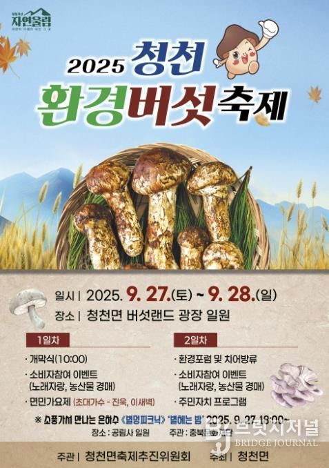 브릿지저널 김경미 기자 | 충북 괴산군 청천면의 대표 지역축제인 ‘2025 청천환경버섯축제’가 오는 27일부터 28일까지 이틀간 청천 버섯랜드 광장 일원에서 열린다.