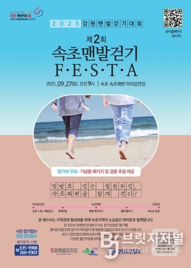브릿지저널 윤나영 기자 | 속초시는 강원특별자치도 및 강원도민일보와 함께 오는 9월 27일 속초해수욕장에서 외옹치해수욕장 구간을 따라 ‘제2회 2025 속초시 강원 맨발걷기 대회’를 연다. 지난해에 이어 두 번째로 마련되는 이번 대회는 자연 속에서 맨발로 걸으며 건강과 힐링을 동시에 경험할 수 있는 특별한 축제다.