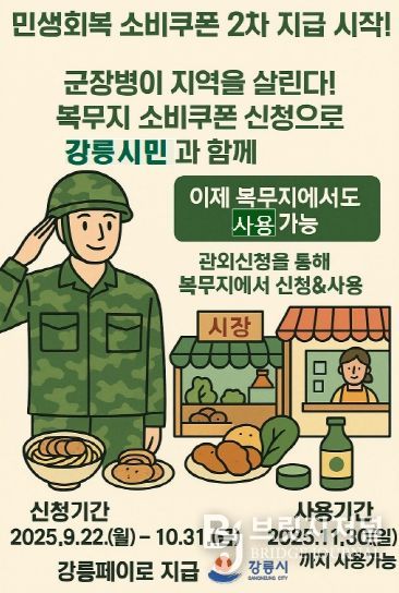 브릿지저널 윤나영 기자 | 강릉시는 민생회복 소비쿠폰 2차 개선 사항인 군 장병 복무지 신청을 위하여, 9월 24일부터 관내 부대를 대상으로 '민생회복 소비쿠폰 군 장병 대상 찾아가는 신청 서비스'를 운영한다.