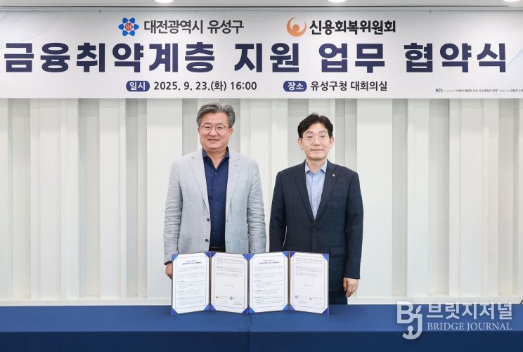브릿지저널 정보영 기자 | 대전 유성구는 지난 23일 신용회복위원회 대전·충청지역본부(지역본부장 이승욱)와 ‘금융 취약계층 지원을 위한 업무협약’을 체결했다.