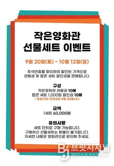 브릿지저널 정보영 기자 | 성주별고을시네마(창의문화센터 3층)는 민족 대명절 추석을 맞아 9월 20일부터 10월 12일까지 ‘추석맞이 선물세트 이벤트’를 진행한다.