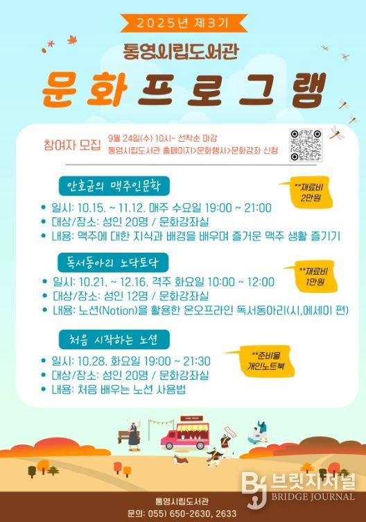 강좌 신청은 9월 24일부터 통영시립도서관 누리집을 통해 선착순으로 접수하며, 자세한 사항은 도서관 누리집을 확인하거나 통영시립도서관으로 문의하면 된다.