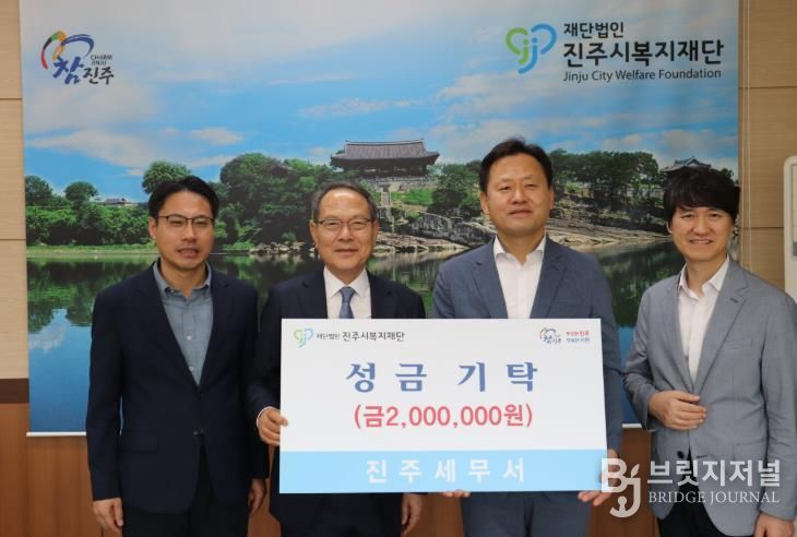 브릿지저널 김경미 기자 | 진주시복지재단은 24일 진주 세무서에서 추석 명절을 맞아 지역사회 어려운 이웃돕기 성금 200만 원을 기탁했다고 밝혔다.