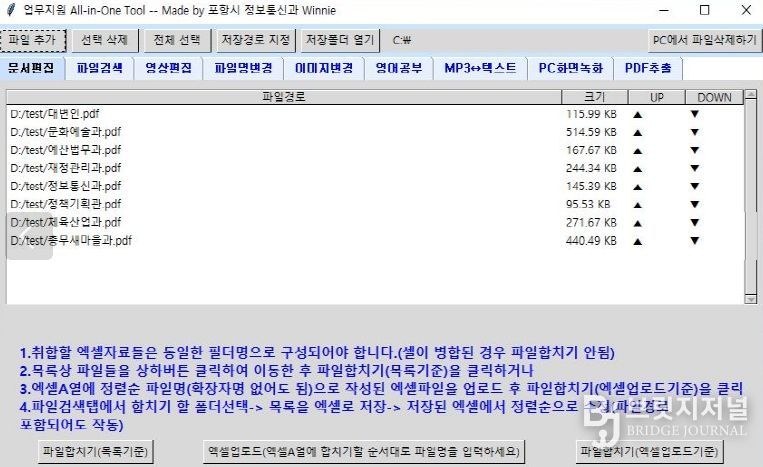 브릿지저널 정보영 기자 | 포항시는 23일부터 시 홈페이지(정보공개-시정자료실, 검색어: 통합툴)에서 반복적이고 복잡한 행정업무를 자동화하기 위해 자체 개발한 ‘업무지원 통합(All-in-One) Tool’을 무료 배포한다.