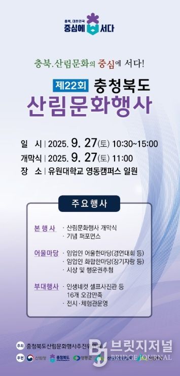 브릿지저널 김경미 기자 | 제22회 충청북도 산림문화행사가 오는 27일 오전 10시 30분부터 영동군 유원대학교 영동캠퍼스 일원(영동읍 대학로 310)에서 열린다.