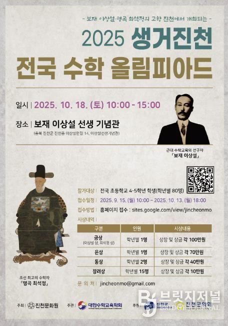 브릿지저널 김경미 기자 | 충북 진천군은 오는 10월 18일 보재 이상설 선생 기념관에서 ‘2025 생거진천 전국 수학 올림피아드’를 개최한다고 25일 밝혔다.