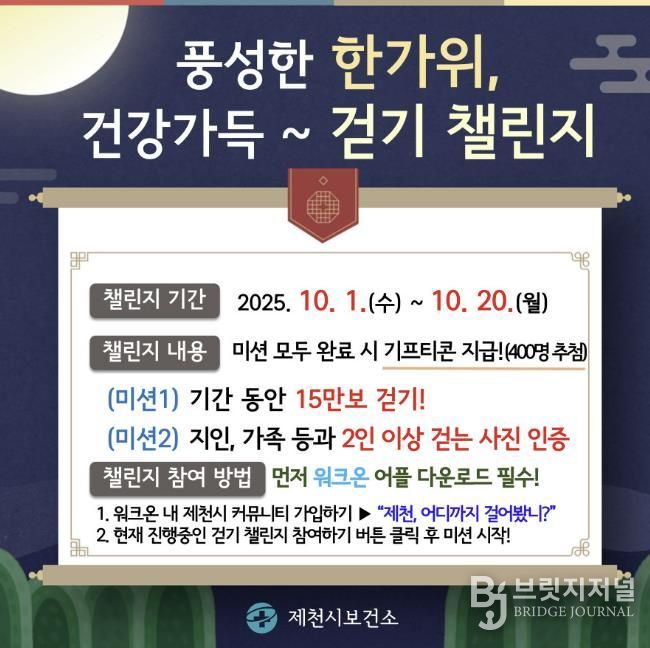 브릿지저널 김경미 기자 | 제천시보건소는 추석 연휴를 맞아 시민의 걷기 실천을 돕기 위해 ‘풍성한 한가위, 건강가득 걷기 챌린지’를 운영한다.