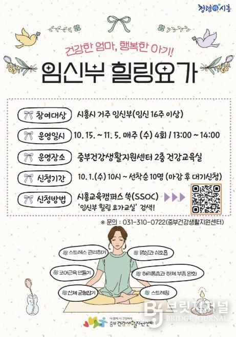 브릿지저널 김경미 기자 | 시흥시보건소 중부건강생활지원센터는 임신부의 신체적ㆍ정신적 건강 증진을 위해 오는 10월 15일부터 11월 5일까지 ‘임신부 힐링 요가교실’을 운영한다. 대상은 관내 임신 16주 이상 임신부로, 선착순 10명을 모집한다.