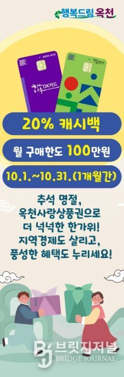 브릿지저널 김경미 기자 | 옥천군이 추석 명절을 맞아 군민 소비 촉진과 지역경제 활성화를 위해 오는 10월 한 달간 향수OK카드(옥천사랑상품권)의 캐시백 혜택을 기존 15%에서 20%로 상향 지원한다.
