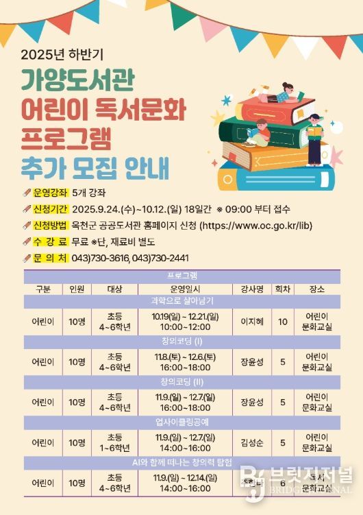브릿지저널 김경미 기자 | 옥천 가양도서관은 군민의 독서문화활동을 지원하기 위해 하반기 어린이 독서문화프로그램 수강생을 추가 모집한다.