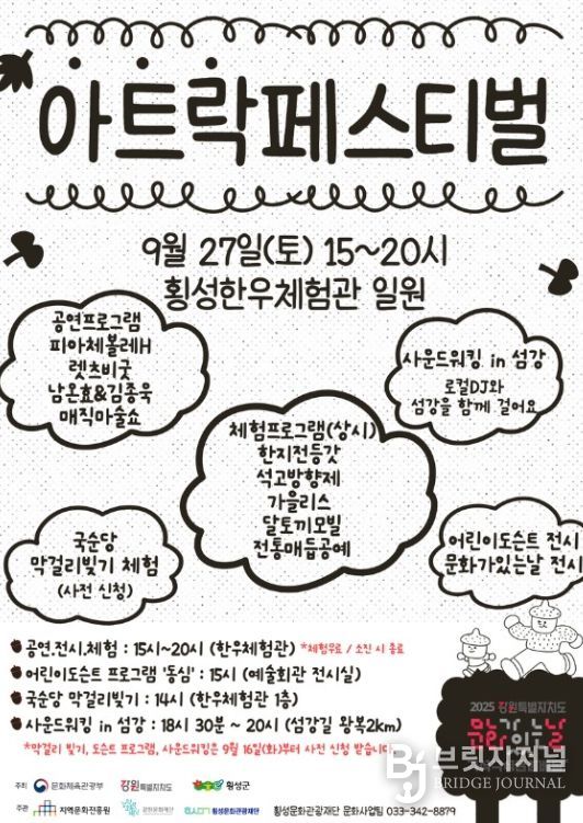 브릿지저널 윤나영 기자 | 횡성문화관광재단은 ‘2025 문화가있는날-아트락페스티벌’을 오는 9월 27일 오후 3시부터 8시까지 횡성한우체험관 일원에서 개최한다고 밝혔다.