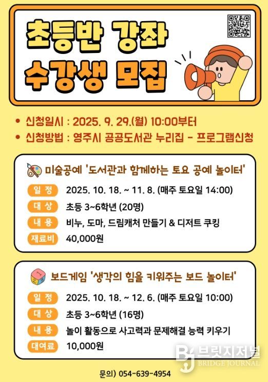 브릿지저널 정보영 기자 | 영주하망도서관은 지역 아동의 창의력과 사고력 향상을 위해 오는 29일부터 초등학생 대상 문화강좌 수강생을 모집한다.