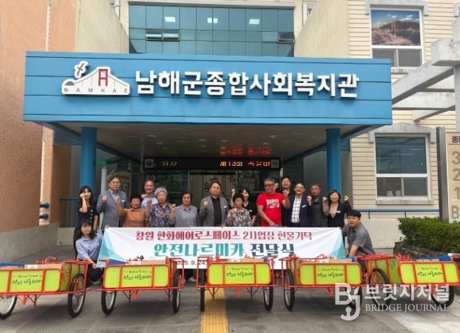 브릿지저널 김경미 기자 | 남해군은 지난 24일 종합사회복지관 앞에서 창원 소재 한화에어로스페이스 2사업장으로부터 기탁받은 안전나르미카를 수혜자에게 전달했다고 밝혔다.