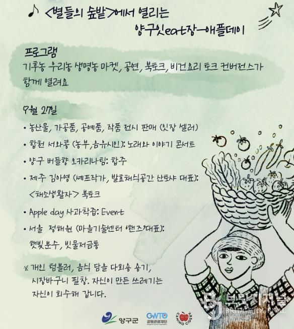 첫날인 27일에는 △양구 햇사과 착즙 시연 △소농들이 직접 운영하는 못난이 농산물 장터 △오카리나 공연 △이야기 콘서트 △태양 관측 필름 만들기 체험 등이 진행된다. 또한 커피와 빵을 비롯해 농산물·가공품, 공예품까지 다양한 상품을 만날 수 있는 마켓도 운영된다.