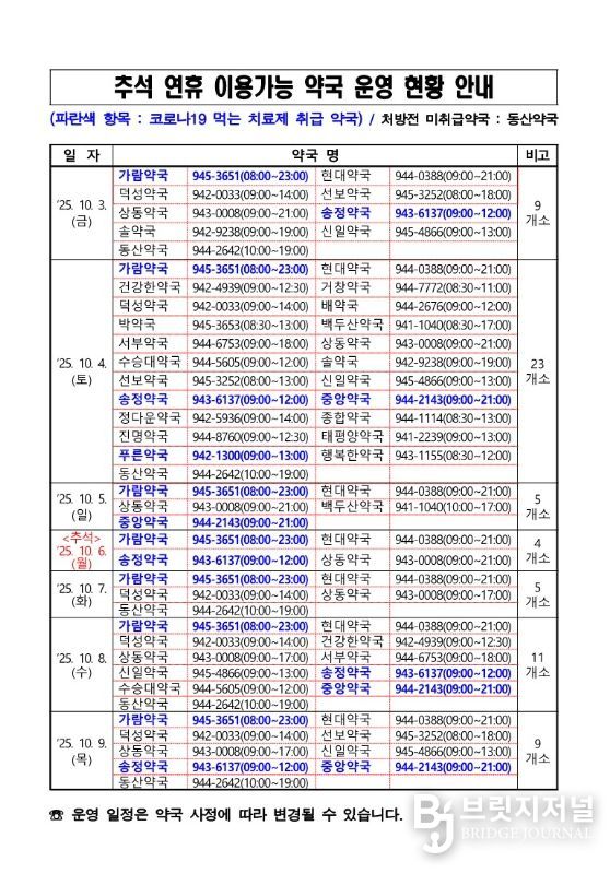 이는 추석 연휴 기간 고향을 방문한 귀성객들이 가족들과 건강한 명절을 보낼 수 있도록 응급의료기관 24시간 가동, 문 여는 병의원과 약국 지정, 응급환자 신속 대응 체계 강화로 의료공백을 최소화하기 위한 것이다.