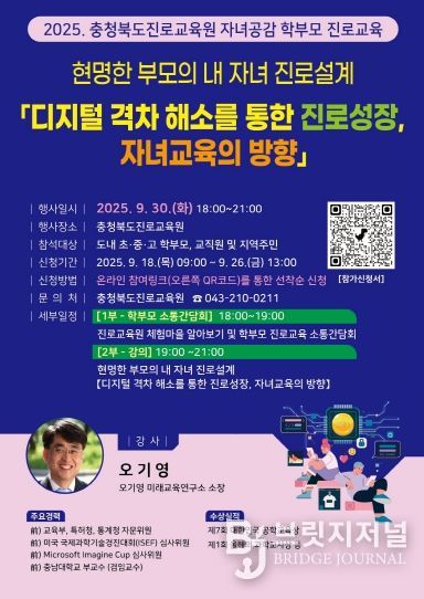 브릿지저널 김경미 기자 | 충청북도교육청 직속기관 진로교육원은 오는 30일 18시에 학부모들이 변화하는 미래사회에 맞춰 자녀의 진로설계 역량을 강화할 수 있도록 2025 하반기 학부모 진로교육을 운영한다고 밝혔다.