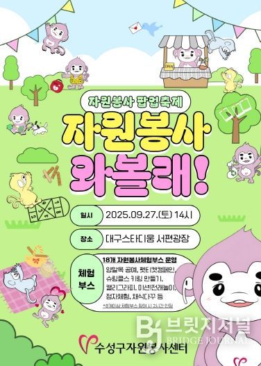브릿지저널 김진석 기자 | 대구 수성구자원봉사센터(센터장 이기덕)는 오는 27일 대구스타디움 서편광장에서 '자원봉사 팝업축제, 자원봉사 와볼래'를 개최한다. 이번 축제는 지역 주민들이 일상 속에서 자원봉사를 쉽게 체험하고, 자연스러운 참여 문화를 확산하기 위해 마련됐다.