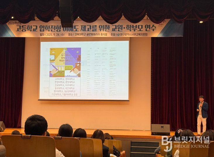 브릿지저널 김진석 기자 | 대구서부교육지원청은 9월 24일 경북대학교 글로벌플라자 효석홀에서 관내 중학교 3학년 학부모와 교원을 대상으로 ‘2026학년도 고등학교 입학전형 이해도 제고를 위한 연수’를 실시했다.