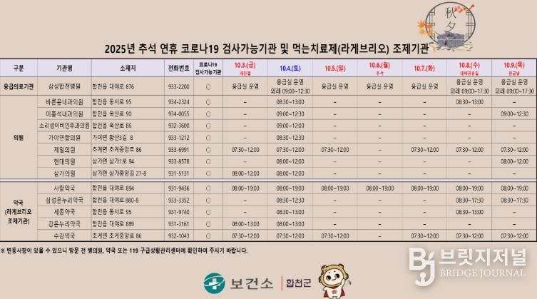 특히 코로나19 먹는치료제 ‘라게브리오’를 연휴기간 운영하는 조제기관에 조정 비치하여 군민들이 치료제 수급에 불편함이 없도록 지원한다.