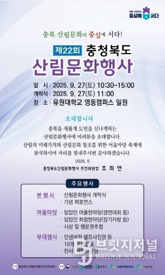 브릿지저널 김경미 기자 | 충북도는 오는 27일 영동군 유원대학교에서 임업인, 산림 관련 기관단체, 일반인들을 대상으로 ‘충청북도 산림문화행사’를 개최한다고 밝혔다.