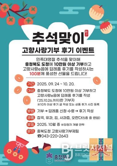 브릿지저널 김경미 기자 | 충북도는 다가오는 추석을 맞아 지역사랑과 나눔 문화를 확산하기 위해 ‘고향사랑기부제’ 특별 이벤트를 9월 24일부터 10월 20일까지 진행한다.