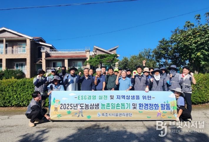 브릿지저널 윤나영 기자 | 속초시시설관리공단(이사장 김태균)은 9월 25일, 1사1촌 자매결연 마을인 응골마을(이장 김상호)에서 농가 일손 돕기와 환경정화 활동을 실시했다.
