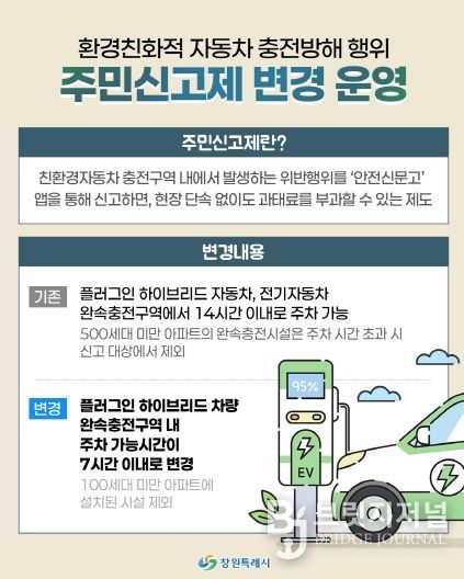 브릿지저널 김경미 기자 | 창원특례시는 환경친화적 자동차의 요건 등에 관한 규정 개정에 따라 환경친화적 자동차 충전방해 행위 주민신고제를 일부 변경해 운영할 예정이라고 25일 밝혔다.