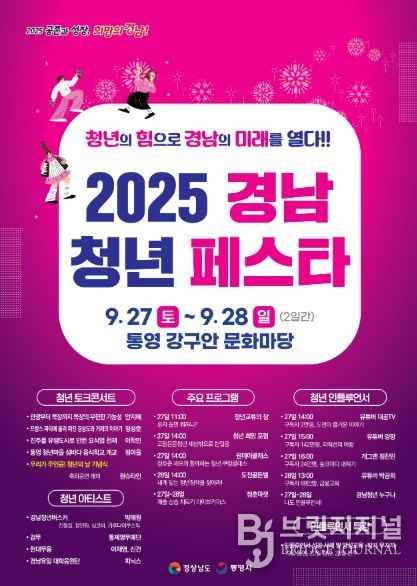 브릿지저널 김경미 기자 | 경남도는 오는 27일부터 28일까지 통영 강구안 문화마당에서 열리는 ‘2025 경남청년 페스타’에서 경남의 청년들이 각 분야에서 꿈을 이뤄가고 있는 이야기를 전한다.