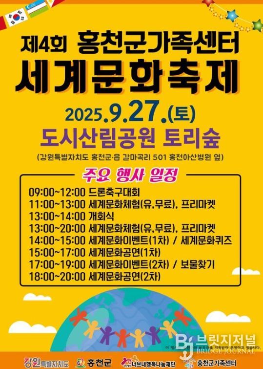 브릿지저널 윤나영 기자 | (사)너브내행복나눔재단(이사장 윤성일) 위탁 홍천군가족센터(센터장 이상훈)는 오는 9월 27일(토) 오전 9시부터 오후 8시까지 홍천도시산림공원 토리숲에서 '2025년 제4회 세계문화축제'를 개최한다.