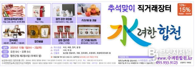 브릿지저널 김경미 기자 | 합천군은 2025년 한가위를 맞아 10월 1일부터 2일까지 이틀간 합천군청 제2청사 입구(합천우체국 옆)에서 ‘추석맞이 농·특산물 직거래장터’를 운영한다.
