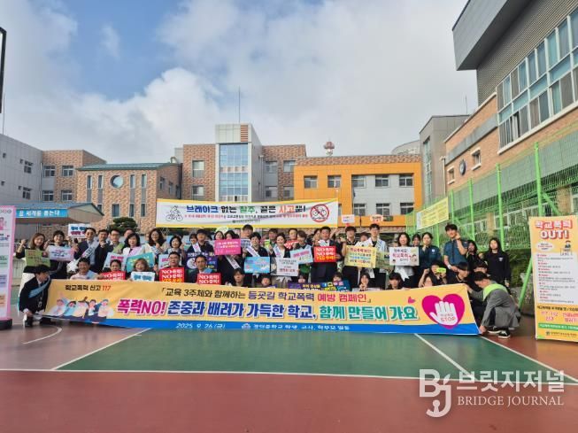 브릿지저널 김경미 기자 | 청주교육지원청과 청주시학교학부모연합회는 9월 26일 흥덕구 경덕중학교에서 학교폭력 예방 및 자전거 교통안전 캠페인을 실시했다.
