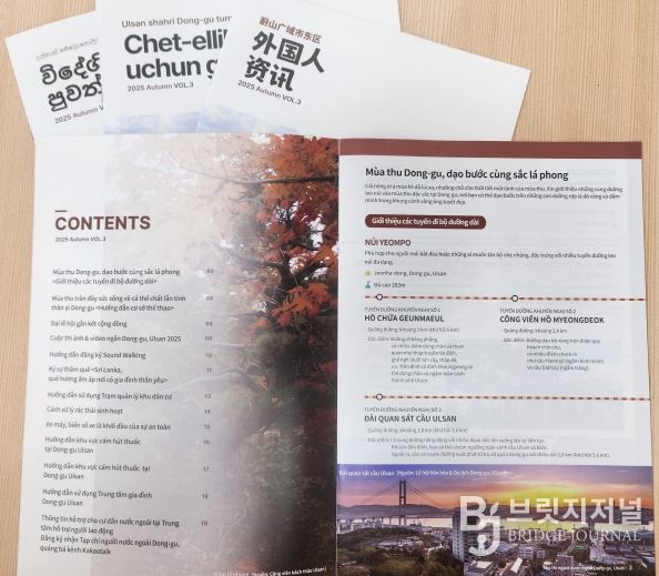 브릿지저널 윤나영 기자 | 울산 동구는 외국인 주민들의 원활한 지역사회 정착과 생활 적응 지원을 위해 ‘동구 외국인 소식지 2025 Autumn vol. 3’를 발행했다. 이번 가을호는 ‘걷기 좋은 계절’을 주제로, 트레킹 코스와 생활체육 정보 등 계절 맞춤형 콘텐츠를 집중 편성해 실용성을 높였다.