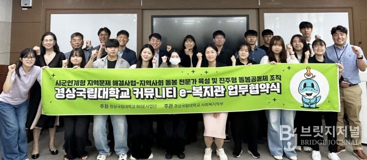 브릿지저널 김경미 기자 | 경상국립대학교라이즈(RISE)사업단 지역리빙랩(진주시) ‘경상국립대학교 커뮤니티 e-복지관’(대학 부설 가상복지관)은 9월 24일 오전 가좌캠퍼스 사회과학관 글로벌룸에서 진주시사회복지협의회, 경남서부권노인보호전문기관, 진주시평거종합사회복지관, 진주시가좌사회복지관, 경남서부권돌봄노동자지원센터와 업무협약을 체결했다.