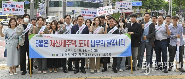 브릿지저널 김진석 기자 | 대구 남구는 지난 24일(수) 남구청 네거리에서 2025년도 정기분 재산세 납부의 달을 맞아 지방세 홍보 캠페인을 실시했다.