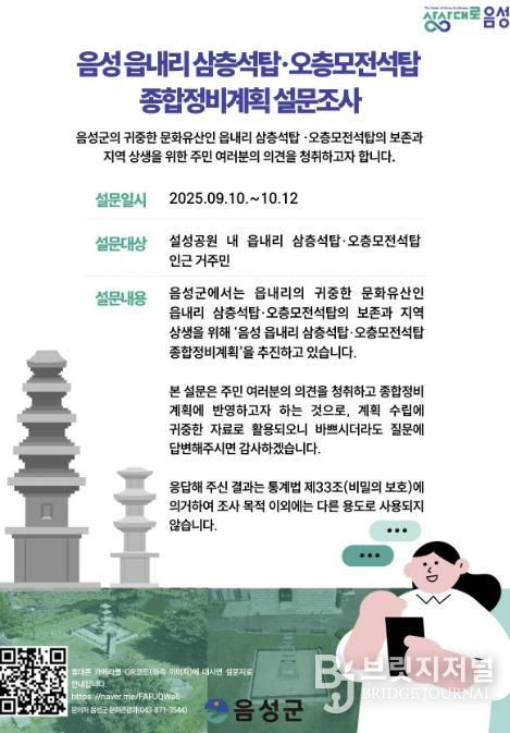 브릿지저널 김경미 기자 | 음성군은 읍내리 설성공원 일원에 위치한 ‘음성 읍내리 삼층석탑’ 및 ‘음성 읍내리 오층모전석탑’의 종합정비계획을 수립하는 과정에서 주민 의견 수렴을 위한 온라인 설문조사를 실시한다고 밝혔다.